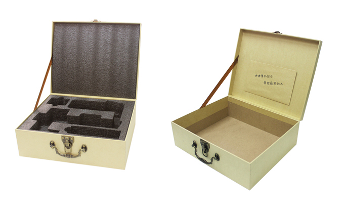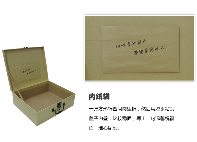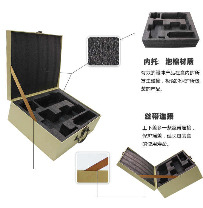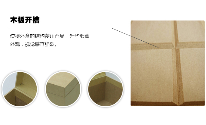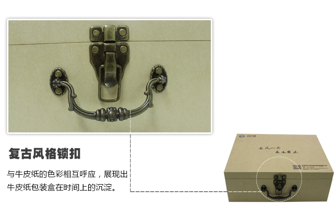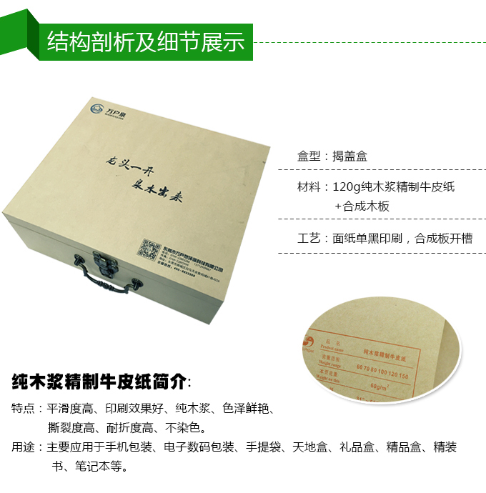 盒型:揭盖盒;材料:120g纯木浆精制牛皮纸+合成木板;工艺:面纸单黑印刷,合成板开槽;木板开槽使得外盒的结构菱角凸显,升华纸盒外观,视觉感官强烈;牛皮纸印单黑,不用过多的色彩,保留牛皮纸独有的风格。